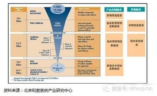 药物研发是一个周期长、费用高,需要多学科综合应用的复杂过程。从临床前,到临床期间,再到申报SFDA批准。就是药物研发就能催生出一个产业,有的企业是做药物筛选的,有的企业是专做动物实验用小白鼠的;临床前要用到很多化合物,可能都要委托生产,这块也有上市公司,如药明康德;还有提供临床实验外包服务的,如刚上市的泰格医药。这些企业的成功要素就是成本低,服务好。