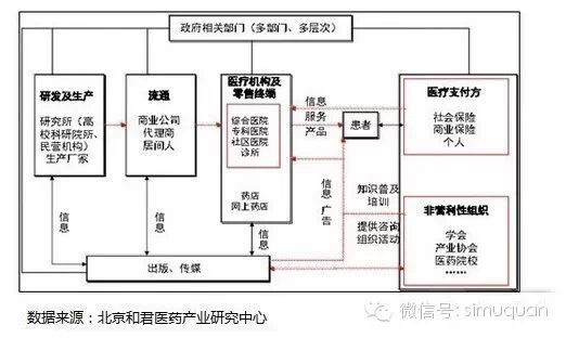 上图描绘的是中国的医疗保健体系,我们看一下,整体来说这个行业受政府的管制非常多,而且是多部门、多层次的管理。从研发、生产、到流通、终端(医院和药店)、患者,再到医疗支付、非营利性组织、出版传媒等,构成了整个体系,体系内的各个环节间相互关联。所以,在这个体系里,每一个环节都不能孤立的去考虑,而是要全面系统的思考。在这张图的基础上,进一步深化,绘制出各个环节的产业地图。