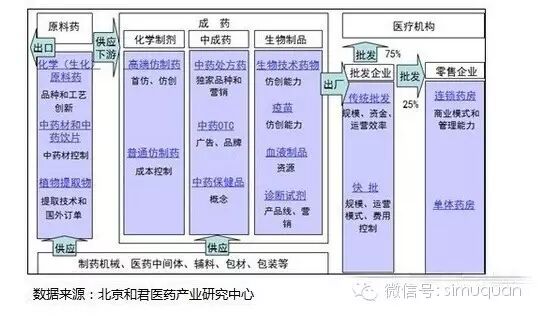 这是一张描述药品生产和流通环节的产业地图,按照药品生产和流通的产业价值链来排布的。我们对每一个环节又做了一个细分,并对每一个细分领域所需要的成功要素做了归纳。比如原料药,可以细分为化学(生化)原料药、中药材和饮片及植物提取物。